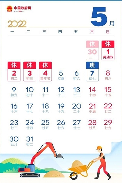 2022年4月30日-5月4日放假調休,共5天。5月7日(星期六)我們正常上班。節前各位同事安排好工作,配合行政做好清潔打掃工作,檢查好電源開關,關好門窗。節日期間,請大家注意人身安全和財產安全,愉快的度過假期。